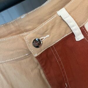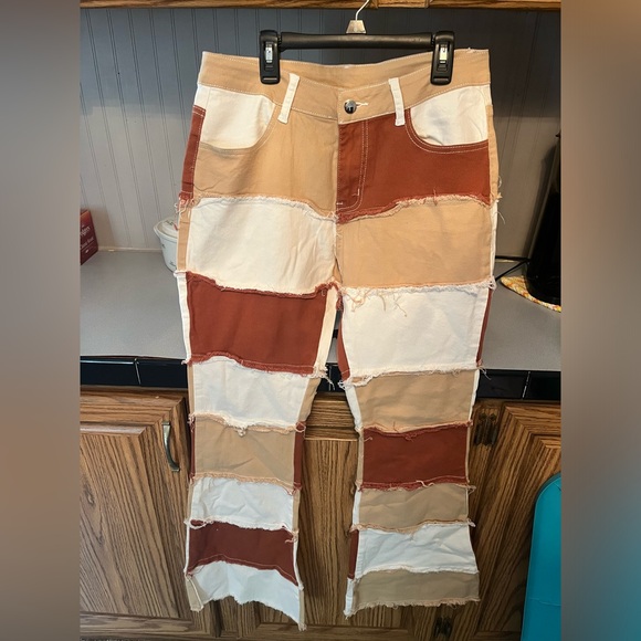 Stylish patchwork jeans with a mix of tan, cream, and brown colors. Unique design for a bold look. New never worn.