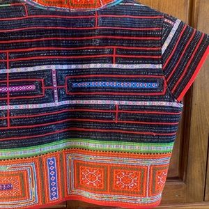 Patchwork vest with decorative embroidery, cross stitching, and ribbons.