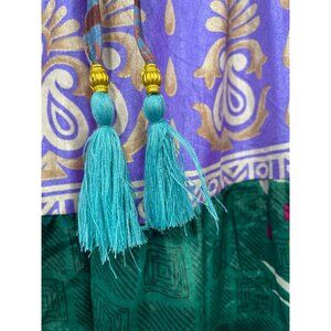 This vibrant boho patchwork pants features multicolored tiered layers with hand-detailed patterns. Designed with an elastic waist and tassel tie closure, it offers both comfort and a unique bohemian festival aesthetic.