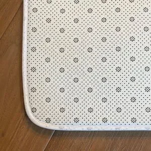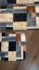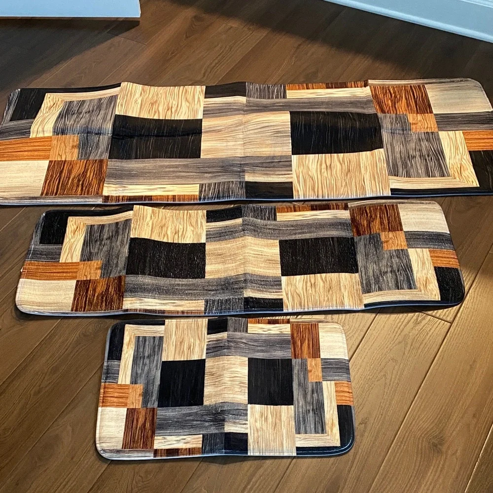 Stylish patchwork rug set with a mix of black, brown, and tan colors. Perfect for adding a modern touch to any room. Three pieces. Lightly padded with nonslip backing. Long runner is 63“ x 23“, middle size is 46“ x 16“ and the smaller rug is 24“ x 16“