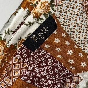 Embrace a bohemian vibe with this patchwork print mini dress. Featuring a mix of brown and cream tones, this dress is perfect for casual outings. The lightweight fabric ensures comfort and style. Never Worn Size Large fits Medium