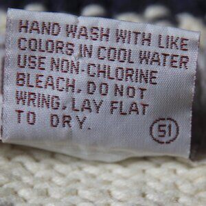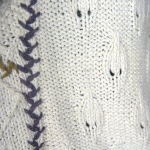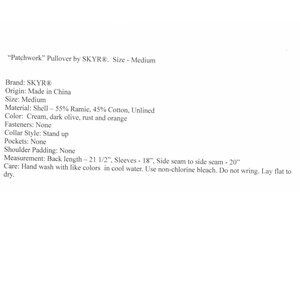 Fun, faux “patchwork” cotton sweater features eight different knitting patterns “patched” together with dark olive, rust and orange “stitches” by SKYR®. Ramie and cotton mix. Preowned and in very good condition. For more information see Details photo.