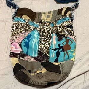 Stylish patchwork shoulder bag featuring a mix of vibrant colors and patterns. Perfect for adding a unique touch to any outfit.