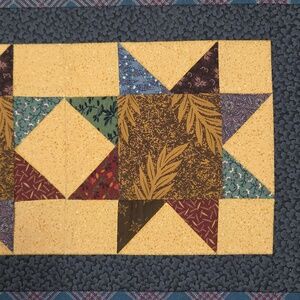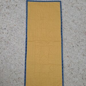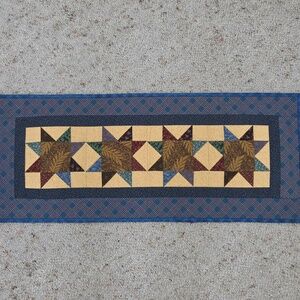 Made in Vermont handmade quilted patchwork table runner. Star block pattern with multi-color fabrics. Checkerboard blue border and yellow center panels. Reverses to a mini dot red on mustard yellow fabric. This piece measures 12 & 5/8" x 30.25". Fast shipping and careful packaging. (C)