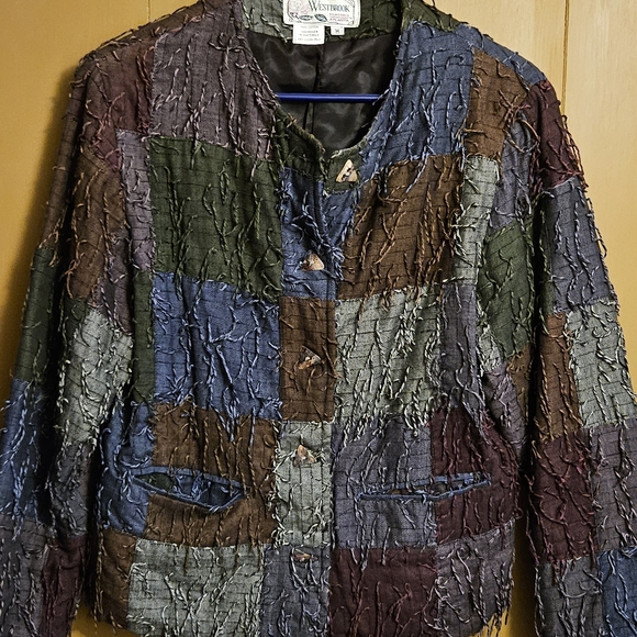 women's patchwork blazer in a textured, lightweight fabric. Tailored, button-front blazer with front welt pockets. Features multicolor patchwork including blue, green, brown and gray for versatile layering.