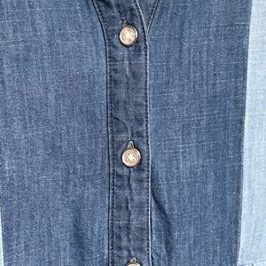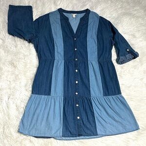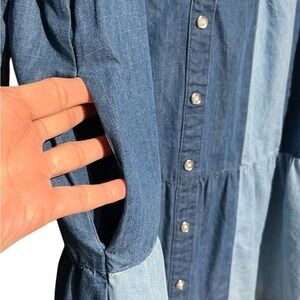 Patchwork Two-Tone Denim Smock Shirt Dress Tunic 3/4 Sleeve Flounce Hem Pockets