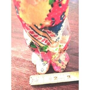 The is decoupage fabric on some type of figurine. It feels like epoxy. I believe it probably had felt on the bottom. It does have a few flaws. On the back of the head (pictured) is a bare spot. It could use a new coat of medium on some areas. Overall, for age it is sweet. The colors are bright with different patterns.