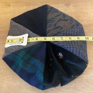 This patchwork beret combines classic herringbone, plaid, and floral patterns with a gray lining for a polished, versatile accessory.