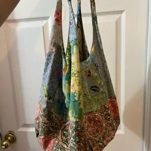 One of my favorite bags! It’s a perfect size tote with a flat structured bottom so things stay organized. There’s a little tear on the shoulder strap when I snagged the string with my ring but it’s not that noticeable with the patchwork and it still worked fine after this whole time. I just got a new tote and it’s time to let her go🥹 open to offers:)