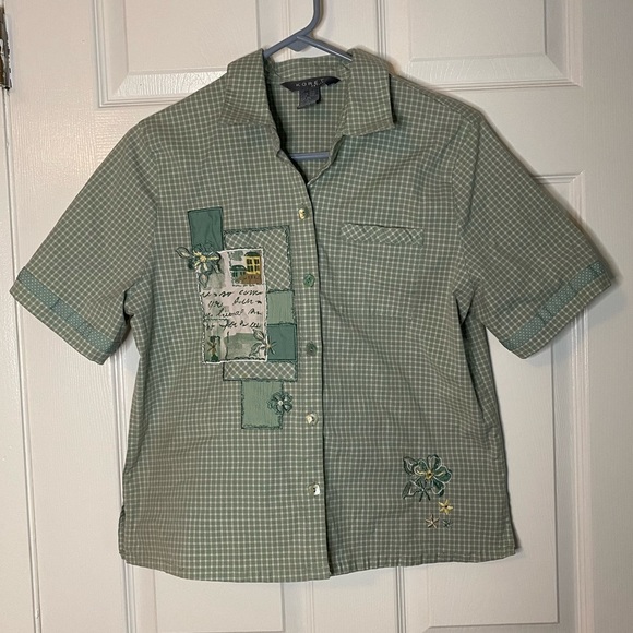 Patchwork button down top Short sleeve Cute green color Size: petite large Vintage