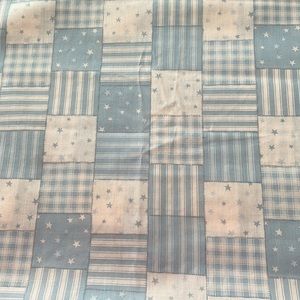 Blue and off white patchwork print fabric Squares are striped, checked and stars Cotton 45” wide 1yd 34”