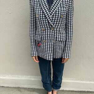 Super unique jacket that I bought at a local makers market a few years ago that just doesn't quite fit anymore. Navy blue and white blazer with unique patches attached! No size on it but fits like a small / 6