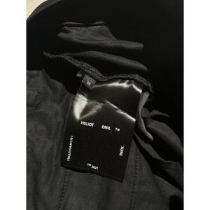 Super cool and functional piece as expected from Heliot Emil. A black nylon with dark gray paneling throughout. Hidden Zippered pockets and cinch ties placed strategically throughout the legs. Comes with the signature metal carabiner.