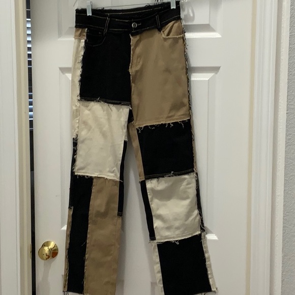 Patchwork jeans, zipper front with back pockets. Soft fabric with tan stitching.