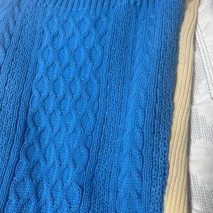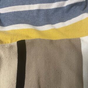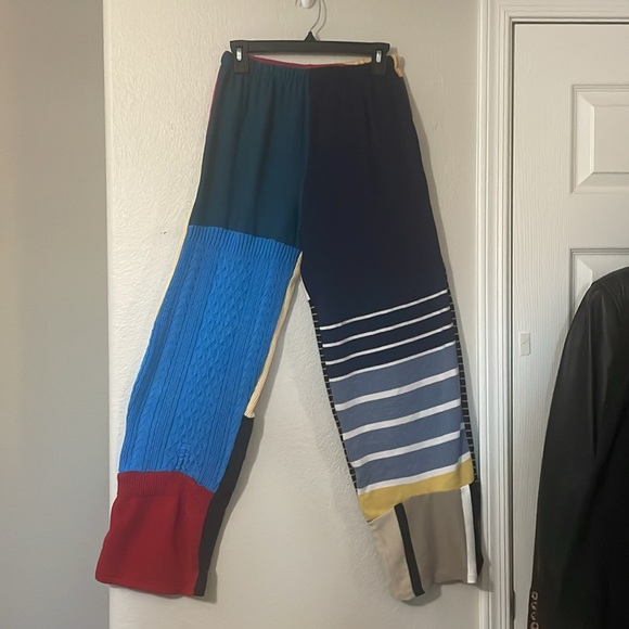 Unique patchwork full leg pants pants. Multi color. Made of lightweight knits. Very soft. No brand just size tag. Elastic waist can fit up to medium. There is a little blue discoloration on yellow fabric on back as seen in picture.