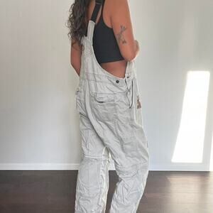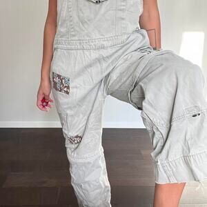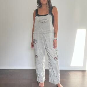 beige overalls with patchwork patches. Pockets and carpenter style. Vintage brand Rosie’s Workwear. Size Large.