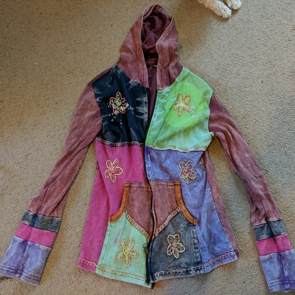 This jacket is perfect for festival season! It's light weight and has a beautiful patchwork design with sewn on flowers. It has a hood and pockets. Runs small.