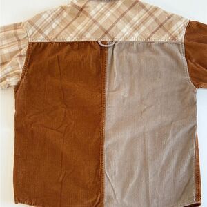Sun + Stone patchwork corduroy long sleeve overshirt. Featuring a mix of brown and tan colors, plaid and corduroy. 100% cotton. Perfect for casual wear, layering, work, school. Used but in excellent condition! Gender neutral. Measurements in photos.