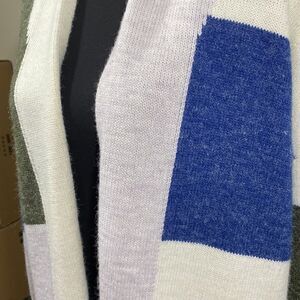 Open front cardigan (no buttons). Patchwork style. 80% Acrylic/ 20% Nylon.