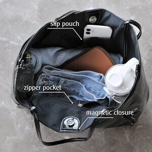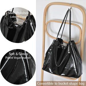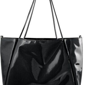 Features: This stylish tote is made from shiny patent faux leather in a classic silhouette that holds everything you need. Sized at 18.8" x 12.6" x 4.7", it’s perfect for daily work commutes or weekend errands. It converts into a bucket shape with lobster clasps on the sides, giving you multiple carrying options. The top magnetic snap makes it easy to access your belongings quickly. Inside, there's enough room for a 14-inch laptop, plus a zipper pocket and slip pouch for smaller essentials. The sturdy double handles feel soft on your shoulder and are comfortable for all-day wear. Its sleek exterior is water-resistant and super easy to clean, so you don't have to worry about dirt or spills.