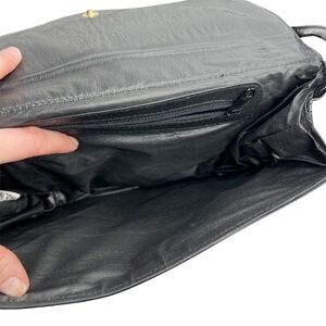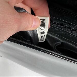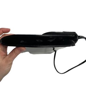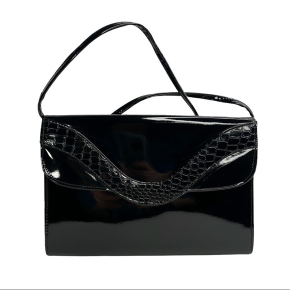 Patent Leather Black Slim Evening Bag Purse With Crocodile Embossed Accents. In gently preowned condition with some light wear at the sides and the inside lining attached to the flap portion has started to bubble. The inside lining feels like a raincoat plastic material. Snap closure with a fold over flap. Structured. One zippered pocket inside. Long thin strap. Made in China. Unbranded. Rectangle in shape. Vintage vibes!
