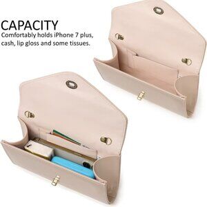 Size: Approx.: 7.87"W x5.1"H x 1.96"D. Enough room for daily basics like small wallet,cell phone, keys,eyeglass,compact mirror, lip gloss, makeup etc.Designed with inner pocket for you to put card and other small thing.