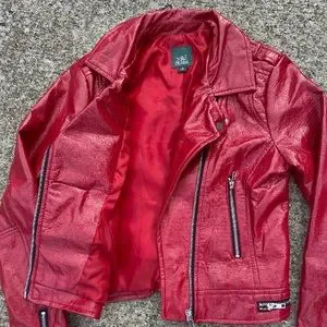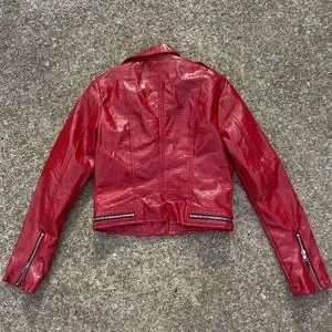 Shiny crimson red faux leather/pleather jacket with alligator/reptile like texture