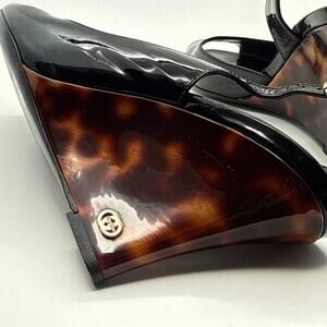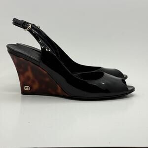 Authentic Gucci Black patent leather wedge heels with a slingback design and peep toe. Elegant and stylish for any occasion. Excellent pre-loved condition.