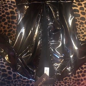 Hot patent romper that has stretch and fits very true to size. Model is wearing a small