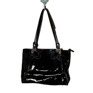 Details: Patent leather beauty by Brighton! Silver toned hardware. Two main separate compartments. One with zipper pocket and card slots, the other with two zipper pockets and slip pockets. Interior is very clean.