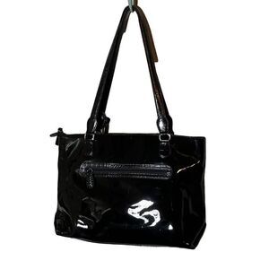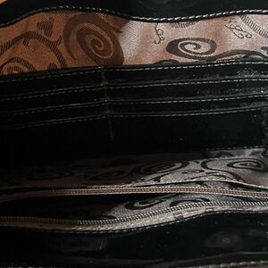 Details: Patent leather beauty by Brighton! Silver toned hardware. Two main separate compartments. One with zipper pocket and card slots, the other with two zipper pockets and slip pockets. Interior is very clean.