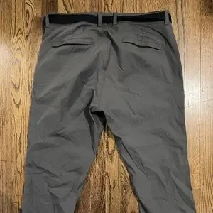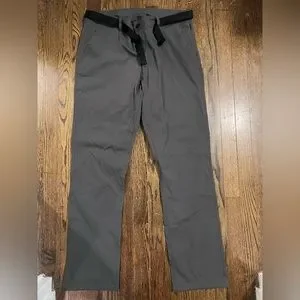 Path Projects pant. Fit like a chino but with a very stretchy material. All pockets on these pants have zippers. The left front pockets zipper broke but the pants have no other issues. These are a size L which fits me great with my typical pants being a size 34 due to my thicker thighs and butt.