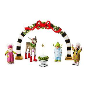 Set includes three carolers, an Irish wolfhound, a potted holly, and a holiday arch, all handmade and hand-painted and trimmed with gold leaf
