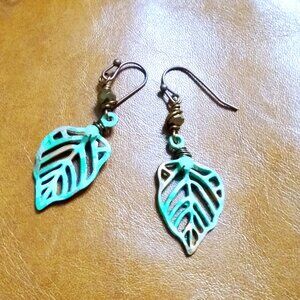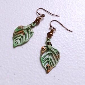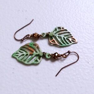 I hand painted these bronze filigree leaves with copper, white and green patina paints, creating a mottled fall leaf appearance, and added tiny faceted bling beads for a bit of extra "extra"! I finished them off with hypoallergenic coated simple earhooks.