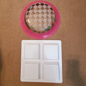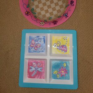 Serve ware for the patio. Fun colors with butterflies and flowers. 14 1/2" bowl and 13 1/2" 4 part dip/ relish square tray and 2 14" square serving trays.