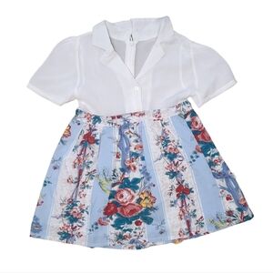 Absolutely adorable dress with vintage cottage look. Features floral print, puff sleeve, lined skirt, 2 front decorative buttons, zipper closure, back of collar has button closure, double breasted collar, soft white upper fabric, vintage cottage style.