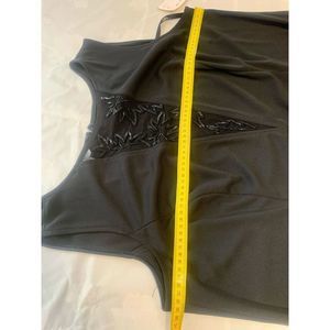 women's dress is super long, unlined, zipper at the back, large slit at the back of the dress, sleeveless, front nylon insert has a beaded leaf design, the insert is translucent.