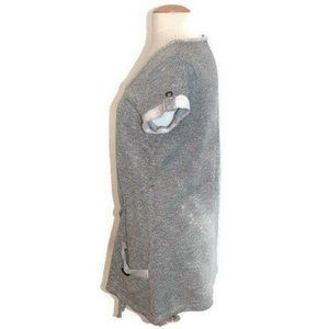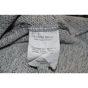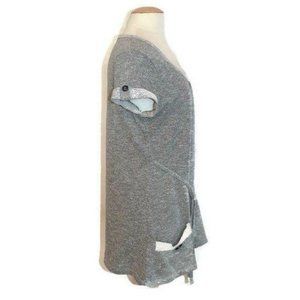 Very Good pre-owned condition. Patrice Breal (France) gray belted tunic knit top. Cap sleeve with buttoned fabric cuff, 2 pockets Euro size 5, US size Large (12)