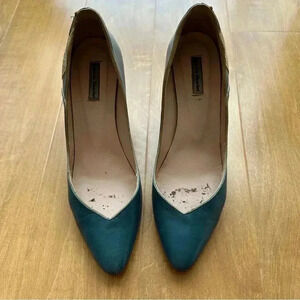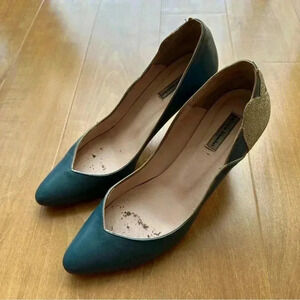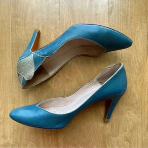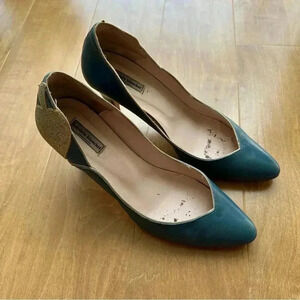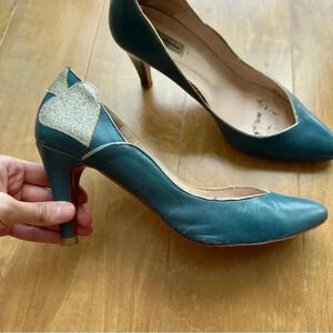 Patricia Blanchet Teal Leather Kitten Heels with Gold Glitter Spade, Size 8.5