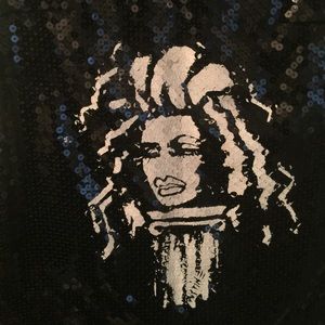 Patricia Field New York Label Brand Dramatic Black Sequins Artistic Sketched Outline of Model White Faced Top. Made of shiny sequins/polyester.Rounded scoop neck. Garment tag reads Size 4 US,but Fits more like an extra small. Extra Fitted in the bust area; not a lot of give in that area.Goes One step above your average T-shirt for a more dressy look! Goes great with a pair of black slacks, jeans or leggings. Like Brand new! Mint condition, hardly ever worn! All sequins intact no holes or stains!