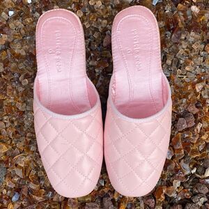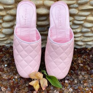 Patricia Green Coco light pink leather quilted slippers. Size 6. New w/box! Never Worn. Small crack in the leather on one slipper (see photo). Ships from a smoke and pet free home.
