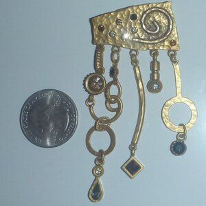 Patricia Locke Tooled Gold Swarovski Crystals Abstract Modern Brooch Pin.