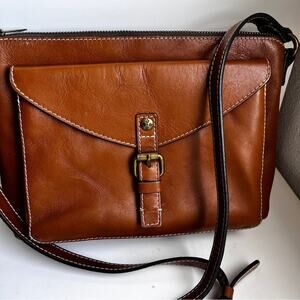 Patricia Nash Avellino Crossbody bag. This stylish tan leather crossbody bag is perfect for any occasion. Its sleek design and adjustable strap offer both comfort and versatility. Buckle detailing. Ideal for keeping your essentials organized and within reach.