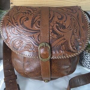 This saddle-style crossbody bag is crafted from full-qrain Italian leather, featuring distinctive elements like hand-tooled details or signature embossing (like the floral pattern seen on yours), burned edges, and antique brass hardware. The design is inspired by traditional saddlebags and is recognized for its country- chic aesthetic and durable construction.