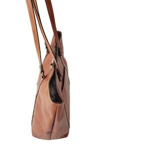 The Patricia Nash Benvenuto Heritage Tote in Tan Leather is a stylish and versatile shoulder bag perfect for casual, workwear, or business occasions. Featuring a rectangular shape with double turn lock closure and brass hardware, this large tote has a timeless and classic Western theme. The natural tan exterior and tan leather handles add a touch of elegance, while the sueded fabric lining provides comfort. With inner pockets and a spacious design, this tote is both practical and fashionable, making it a must-have accessory for any woman's wardrobe. The original dust bag included adds an extra touch of luxury to this chic handbag.