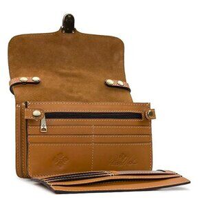 Exterior: 1 front snap compartment with 9 credit card slots, ID window, 1 zip pocket, 1 rear slip pocket with magnetic closure, braid detailing, burned edge finish Push-lock closure