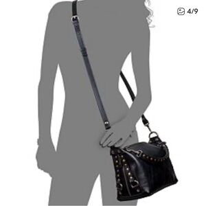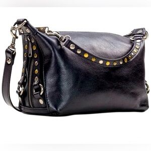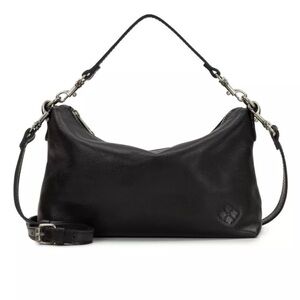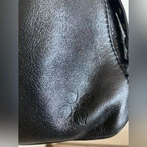 Chic black leather shoulder bag. Features elegant design and adjustable strap. Ideal for versatile styling.