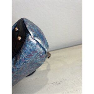 The Patricia Nash Blue Embossed Floral Leather Snap Latch Doctor Style Shoulder Bag is a medium-sized satchel/top handle bag made of leather with a beautiful metallic blue exterior and gunmetal hardware accents. The bag features a cute floral pattern in blue, a latch closure, and a suede lining in beige. It also includes inner pockets for organization and bottom studs for added durability. The design is perfect for women who appreciate designer, floral, Italian, and bohemian styles, making it a versatile and stylish accessory for any outfit.