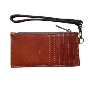 The interior lining is also made of leather and features a brown color that complements the exterior. The hardware is made of metal and has an antique brass finish that adds a touch of elegance to the wallet. The wristlet strap is made of leather and has a brown color that matches the wallet itself. This wallet is perfect for any occasion, especially travel.
