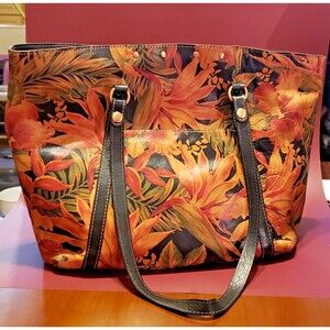 The Patricia Nash Cuban Tropical Paradise Leather Satchel is a large, trapezoid-shaped bag with a clasp closure and double black leather handles. The exterior features a multicolor floral pattern, brass hardware accents, and outer pockets for added functionality. This vintage-inspired tote is perfect for travel or casual occasions, with a tropical theme that adds a touch of exotic flair to any outfit. Made from high-quality leather with a caramel lining, this satchel exudes both style and luxury, making it a must-have accessory for any fashion-forward woman.